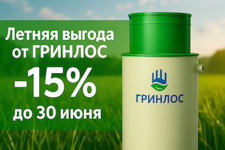 Новый сезон мы предлагаем начать выгодно: все септики ГРИНЛОС со скидкой 15%! Не упустите возможность стать обладателем надежного и эффективного септика по выгодной цене!